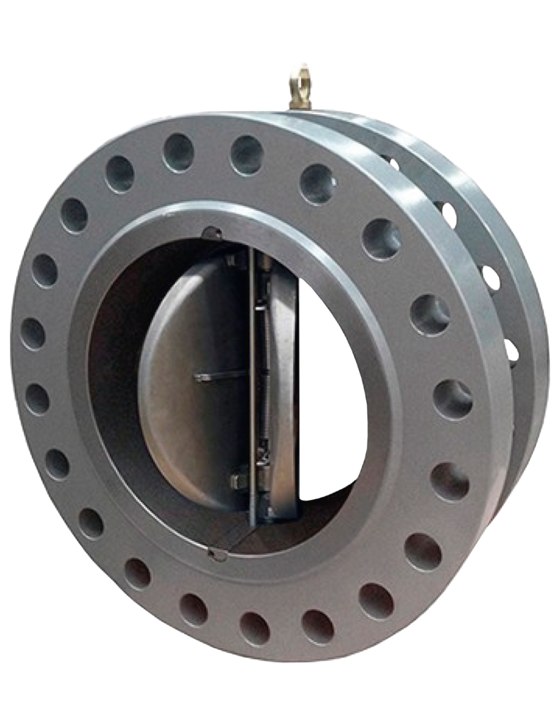 La válvula de retención de placa doble emplea dos placas con resorte articuladas en un pasador de bisagra central. Cuando el flujo disminuye, las placas se cierran por la acción del resorte de torsión sin requerir flujo inverso.